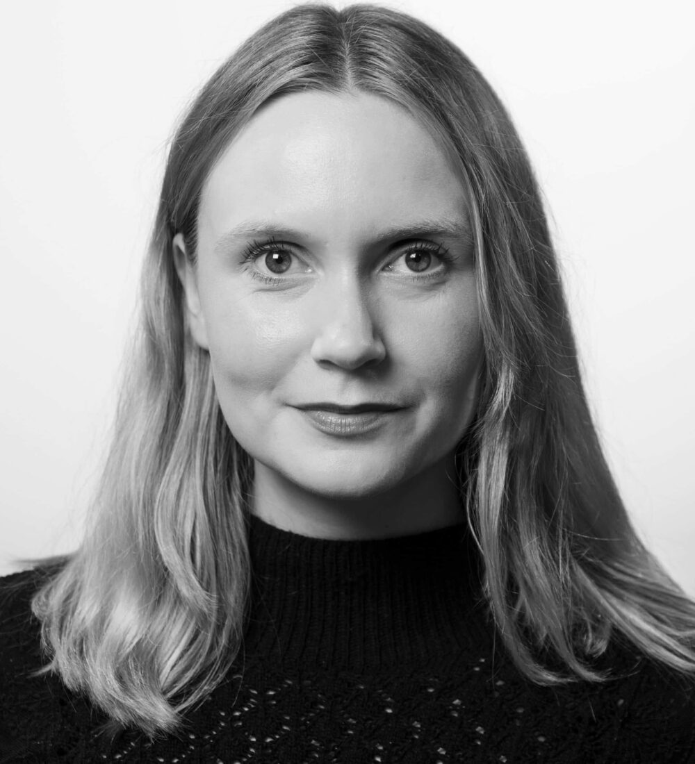En kvinne med rett, skulderlangt hår og nøytralt uttrykk bærer en mørk, strukturert genser, fotografert mot en enkel, lys bakgrunn i svart og hvitt.
