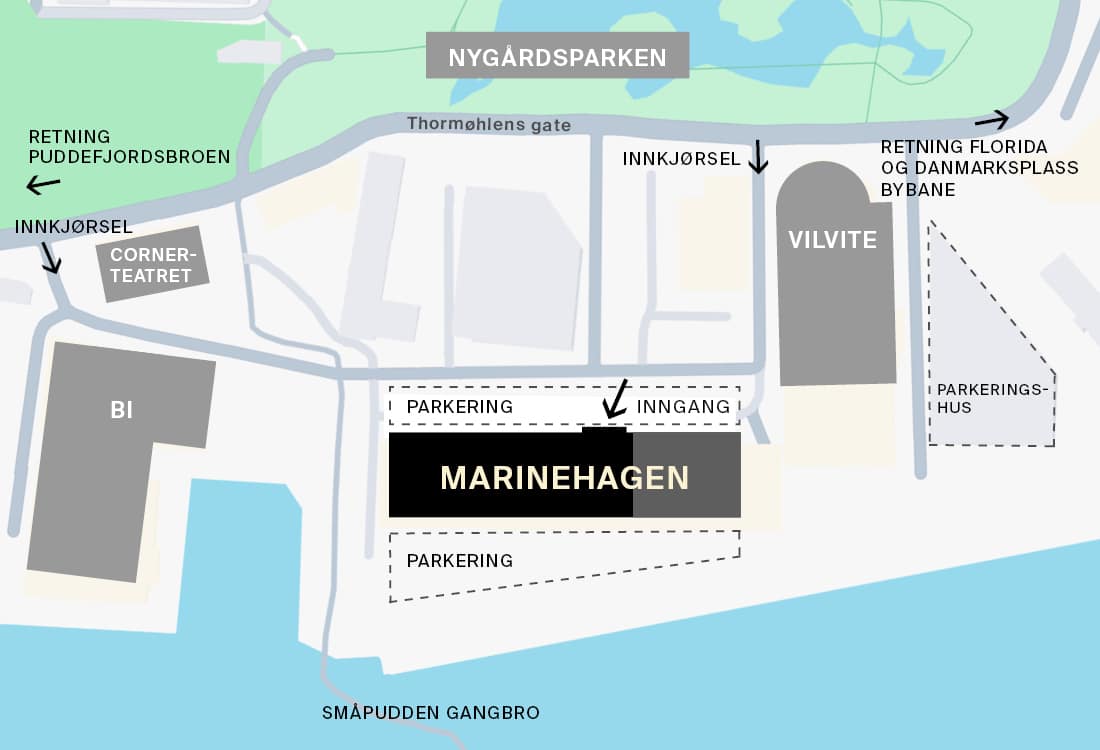 Marinehagen ligger på Marineholmen på Møhlenpris, ved siden av VilVite. Det er lett å komme seg dit både med bil og kollektivtransport.